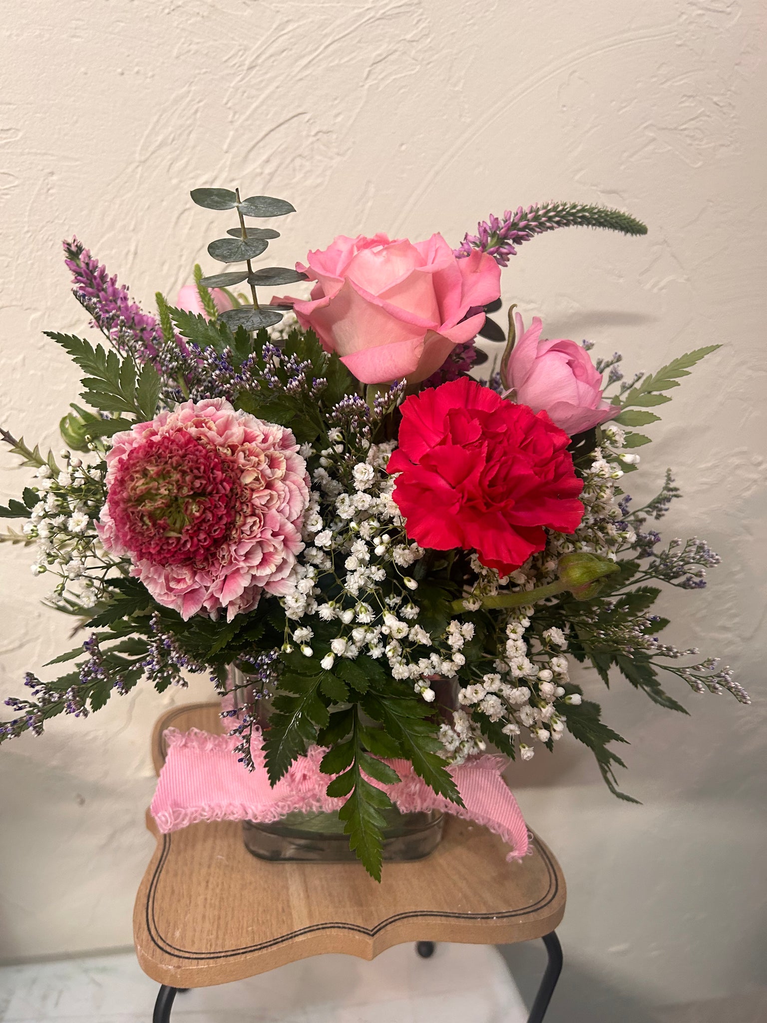 A colorful mix arranged in a small square glass vase wrapped in a fun ribbon. Colors may vary. You can make note of colors you’d like in notes.